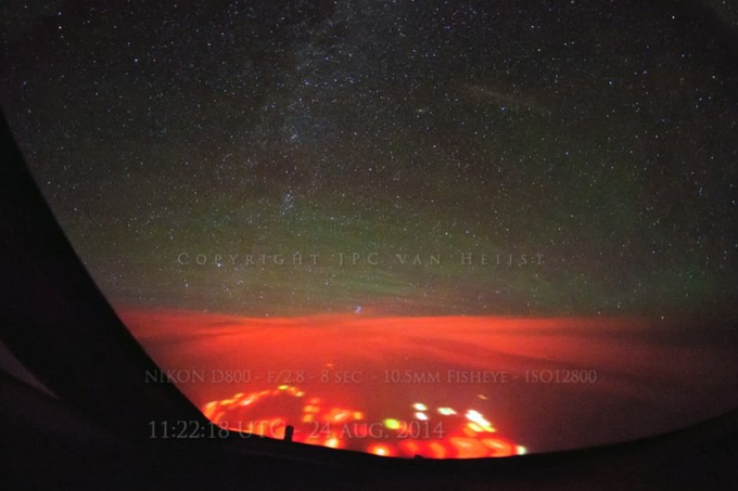 “Decidí tomar algunas fotos del cielo nocturno y del extraño resplandor verde que había por todo el hemisferio norte”, relata el piloto, agregando que unos 20 minutos más tarde se dio cuenta de la presencia ante ellos de un profundo resplandor de color rojo-anaranjado. “Eso fue un poco extraño, ya que se suponía que no había nada más que un océano infinito debajo de nosotros”, dice.